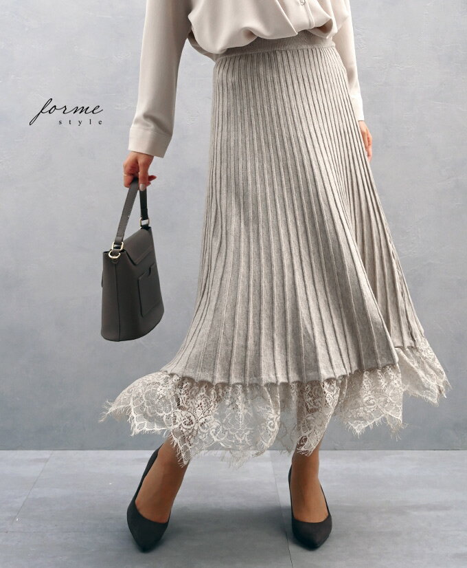 (ベージュ グレー)足元美人な裾レースプリーツスカート「forme」【再入荷♪1月3日20時より(グレーのみ)】スカート ロングスカート 裾レース ストライプ ニットスカート Aライン マキシ丈 総ゴム レディース フリーサイズ【F191112】【S200103】