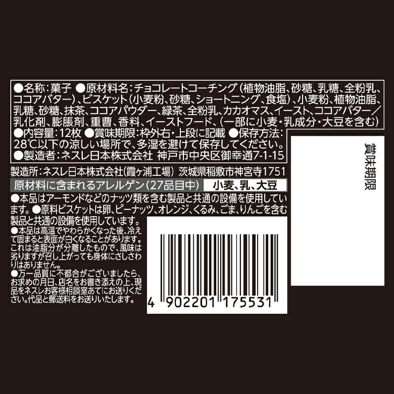 【原材料名】:チョコレートコーチング(植物油脂、砂糖、乳糖、全粉乳、ココアバター)、ビスケット(小麦粉、砂糖、ショートニング、食塩)、小麦粉、植物油脂、乳糖、砂糖、抹茶、ココアパウダー、緑茶、全粉乳、カカオマス、イースト、ココアバター/乳化剤、膨脹剤、重曹、香料、イーストフード、(一部に小麦・乳成分・大豆を含む)【備考】:本品は高温でやわらかくなった後、冷えて固まると表面が白くなることがあります。